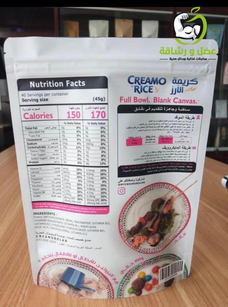 - يعتبر مكمل كريمة الارز من المكملات الغنية بالكربوهيدرات والتي تزود الجسم بالطاقة اللازمة لممارسة الرياضة من أجل تحقيق أفضل أداء. يوفر عضل ورشاقة مكمل كريمة الارز البديل الصحي للحصول على حصتك اليومية من الكربوهيدرات.