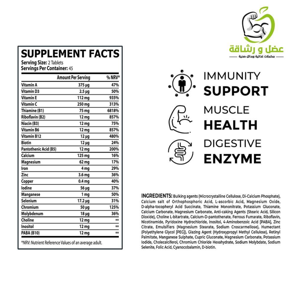 - تم اختيار كل مكون حبوب مالتي فيتامين بعناية بهدف تقديم نتائج لمساعدة جسمك على الظهور و الأداء بأفضل ما لديه.